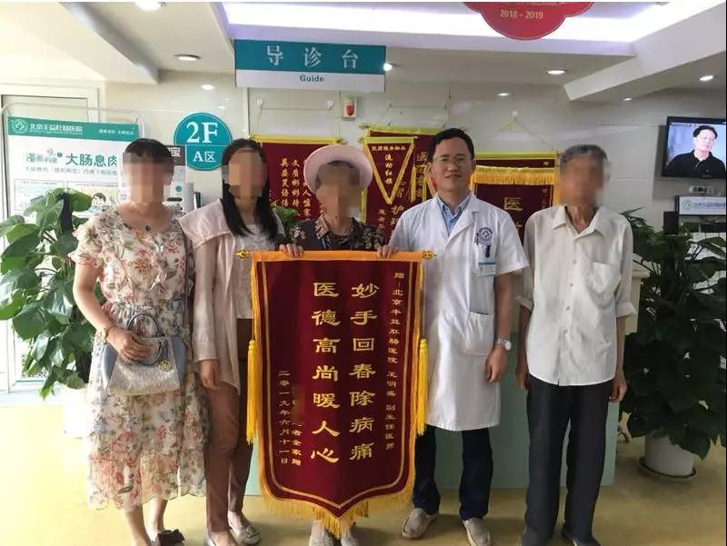 2019年6月15日,患者贺女士在全家的陪同下将一面绣有“妙手回春除病痛 医德高尚暖人心”的锦旗赠给了北京丰益肛肠医院肛肠医生王明盛主任,感谢王主任牺牲休息时间给予的精心治疗和无微不至的照顾,让贺女士重燃对生活的热情。