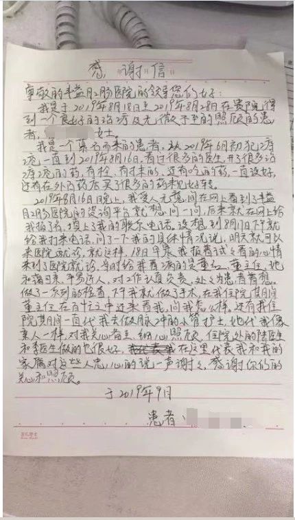 9月10日的上午,北京丰益肛肠医院门诊收到了一封来自患者曹女士的亲笔表扬信,整篇信上都表达了曹女士对医务工作者管文英满满的感谢之情。
